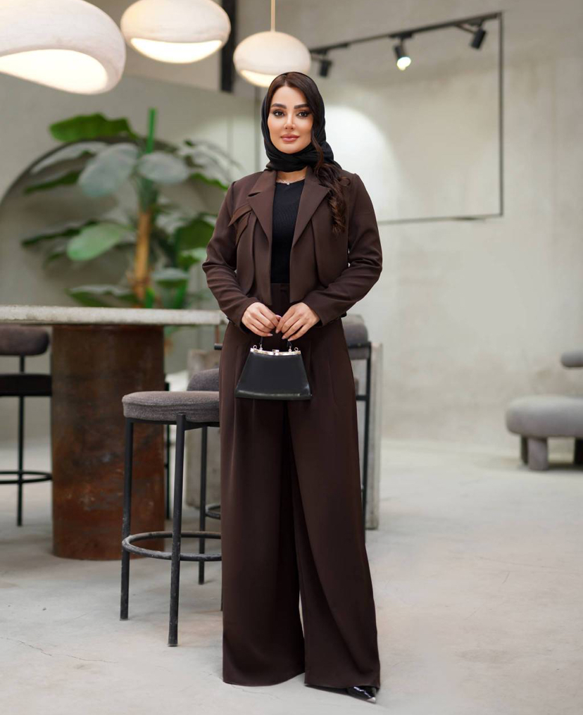 ست دو تیکه کت سفید و شلوار قهوه ای کرپ مازراتی درجه ۱ ژاله