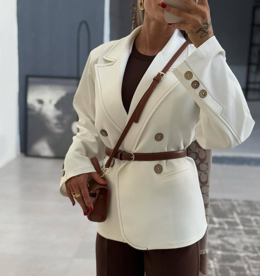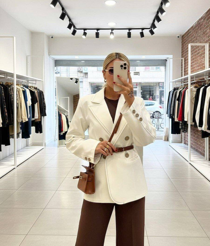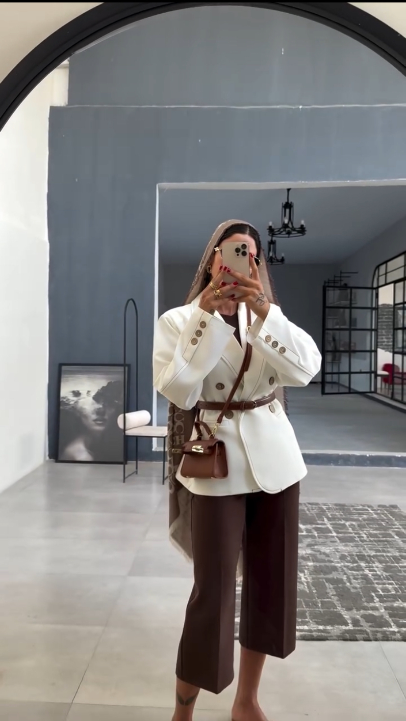 ست دو تیکه کت سفید و شلوار قهوه ای کرپ مازراتی درجه ۱ ژاله